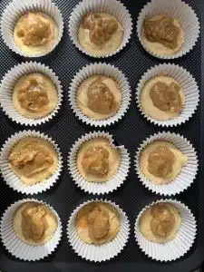 - Add muffin mix into 12 muffin cases that covers about half each case, then add a dessert spoon of caramel then cover with more muffin mix till its just under the patty case top. Repeat on remaining cases.