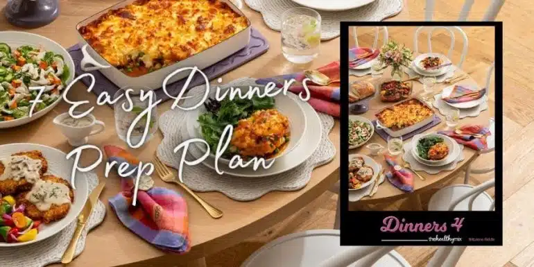 Ready to transform your weeknights? This 7 Easy Meals Prep Plan is available as a FREE digital download when you purchase your copy of Skinnymixers Dinners 4.