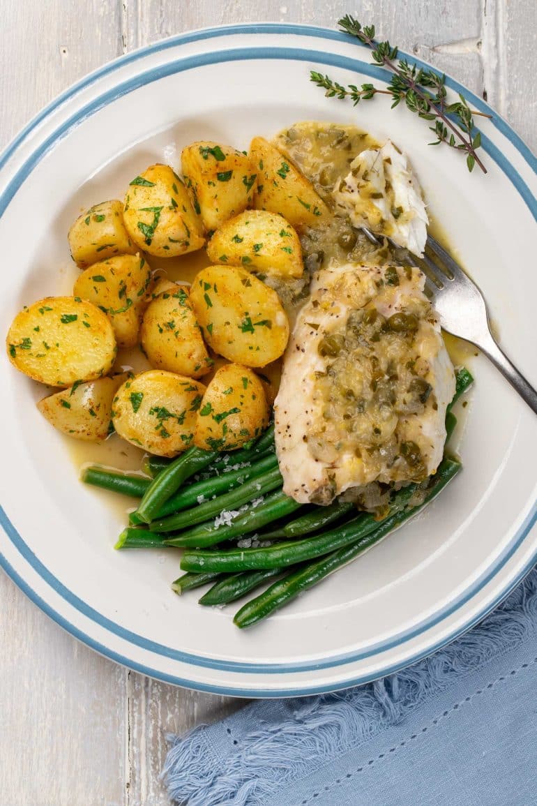 Skinnymixer’s Fish Piccata ‘All in one’ Dinner features in the Fast section of the cookbook SkinnyMediterranean. Fish Piccata: golden pan-seared fish fillets with a buttery lemon caper sauce. Light, fresh and full of Mediterranean flavour.