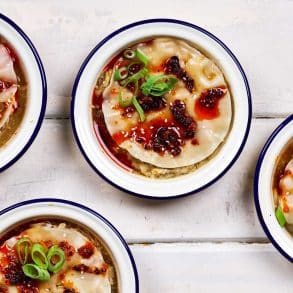 Place a dumpling wrapper in the ramekin, spread 1–2 Tbsp filling over wrapper and repeat layers to the top. Finish with a wrapper layer
